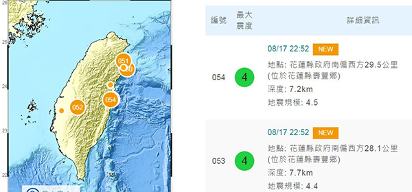 中国台湾网8月18日讯 据台湾《联合报》报道,台湾花莲昨日(17日)晚间22点52分隔5秒连两震。台湾“中央气象局”昨晚连续发布两次地震报告,前者是22:52:05发震,规模里氏4.4级,后者是22:52:10发震,后者规模里氏4.5级。