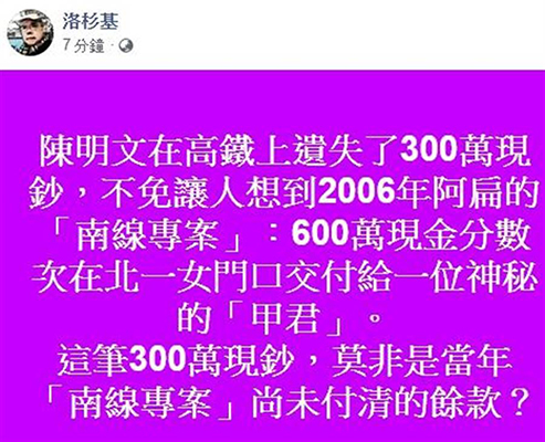 洛杉基表示,陈明文在高铁上遗失了300万现钞,不免让人想到2006年陈水扁的“南线专案”。他解释道,2006年600万现金分数次在台湾北一女中门口交付给一位神秘的“甲君”,这笔300万现钞莫非是当年“南线专案”尚未付清的余款?