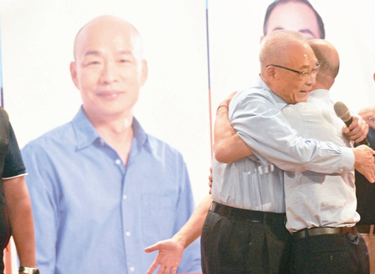 韩国瑜与吴敦义合体,相互拥抱,用行动突破“换瑜说”(图片来源:台湾《联合报》)