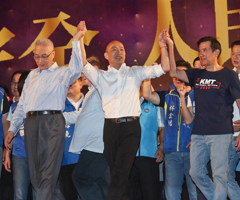 国民党2020台湾地区领导人选举提名人韩国瑜(中)8日在新北市三重幸福水漾公园举办“2020新北出发”晚会,前台湾地区领导人马英九(右)与国民党主席吴敦义(左)牵著韩国瑜的手,现身力挺。(图片来源:台湾“中时电子报”)