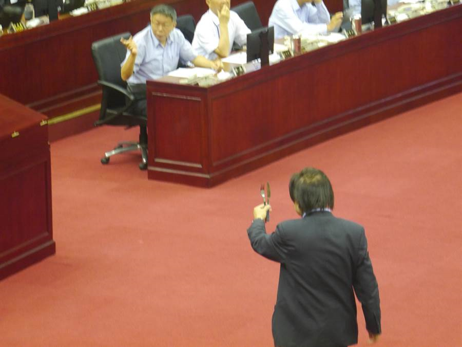 台北市议员王世坚今(11日)在台北市议会上,拿出刀叉送给柯文哲,叫柯别再用刀叉吃人肉。(图片来源:台湾“中时电子报”)
