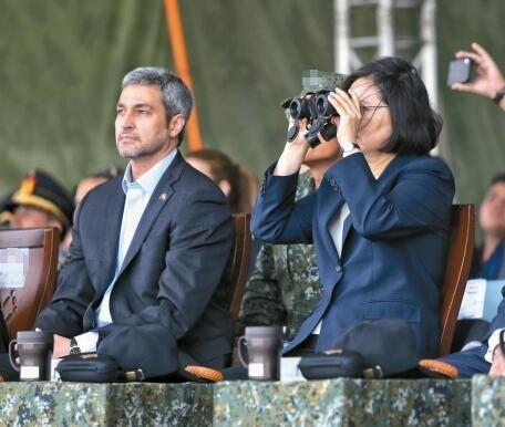 2018年,蔡英文与巴拉圭总统贝尼特斯(左)观看台军演习。(图片来源:台湾《联合报》)