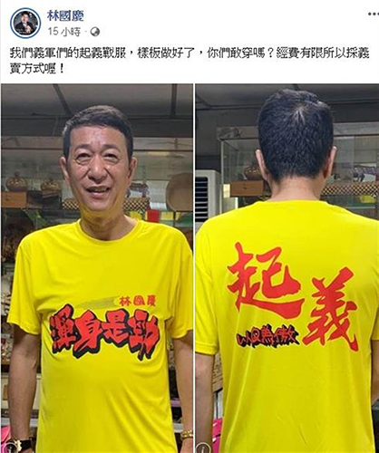 林国庆下定决心要打破“明文规定”、势力庞大的陈明文,在脸谱网(facebook)秀出“起义战服”,问大家敢穿吗?(图片取自台媒)