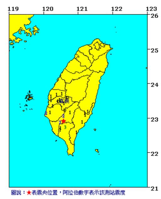 最后,02时42分高雄又有地震,震中同样在高雄市政府东北方43.2公里,位于高雄市六龟区,地震规模4.2级,最大震度屏东县3级;高雄市、台南市2级;嘉义县、台东县、嘉义市、云林县、花莲县1级。(中国台湾网 李宁)