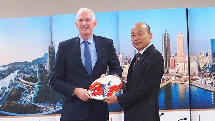 中国台湾网10月18日讯 据台湾“中时电子报”报道,国民党参选人韩国瑜请假投入2020选举,16日起展开“环岛倾听学习之旅”。今日(18日)结束2日行程后暂停半天,上午销假回到高雄市府,与“美国在台协会(AIT)主席”莫健见面。