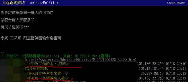 台湾批踢踢论坛上的网友看到这个场面,也纷纷震撼表示,“那些说苗栗是同一批人的1450们,怎么台南人那么多?明天才造势耶”、“呵呵呵,民调越高人越少”、“真的很多,别小看铁粉”、“1450会崩崩啦”!(中国台湾网 杨旋)