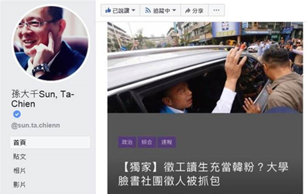 中国台湾网10月23日讯 据台湾“中时电子报”报道,国民党2020参选人韩国瑜阵营,日前在台湾中正大学校园脸谱网(facebook)社团“中正大学不分系级版”中征求工读生。但有一家台湾网媒解读成是“被抓包征工读生充当韩粉?”韩国瑜北部竞选办公室副执行长孙大千上午(23日)在脸谱网(facebook)批评,“这算不算假新闻?征人消息中哪一句提到韩粉?”