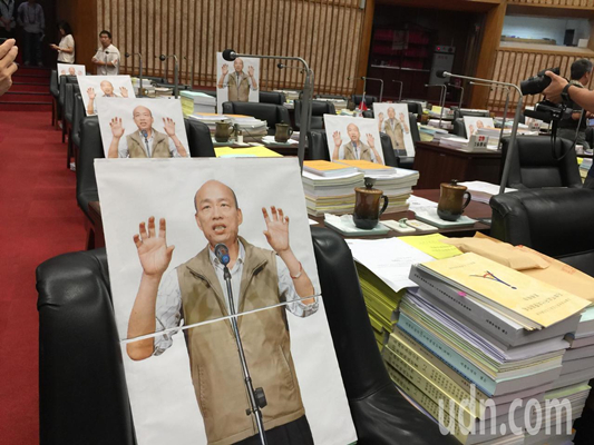 中国台湾网10月31日讯 据台湾《联合报》报道,高雄市议会今天(31日)上午进行市政总质询,下午进行明年度总预算交付审查。由于高雄市长韩国瑜请假,民进党议员上午在议事厅门口和每位民进党籍议员的座位上放着韩国瑜人形立牌。民进党议员扬言,没有市长、没有预算、没有付委。
