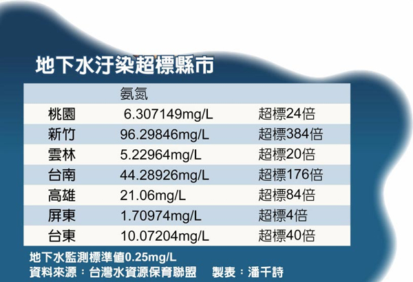 彰化县绿色资源人文保育协会理事长吴丽慧表示,地下水监测标准值为0.25mg/L,但依据台当局“环保署”2015至2019年间的资料,发现台南、高雄、新竹邻近掩埋场的地下水污染最严重。尤其临海的新竹市香山区浸水卫生掩埋场地下水氨氮高达96.298mg/L(约为标准的384倍),位于曾文溪出海口的台南市安南区城西垃圾卫生掩埋场氨氮测出57.56mg/L(约176倍),高雄大寮氨氮测到21.06mg/L(约84倍)。