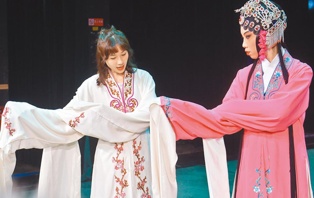两岸文教交流实属常态。图为台湾铭传大学学生前往四川川剧院,向当家花旦学习川剧技巧。(图片来源:台湾“中时电子报”)