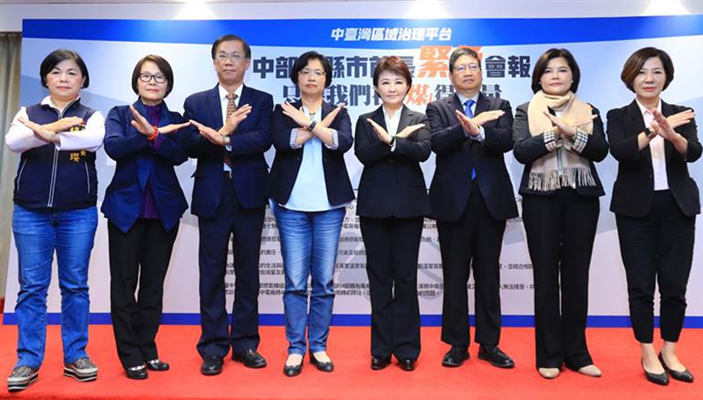7县市首长共同签署“中台湾区域治理平台共同声明”,7人手比打叉手势,怒喊“只要我在,没得商量”。若中火再毒害民众健康,明年1月11日大家用选票下架民进党。(中国台湾网 刘洪羊)