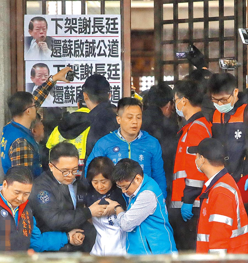 多位国民党“立委”与市议员6日赴台当局“外交部”抗议,警卫关起大门阻挡进入,推挤之下“蓝委”林奕华(下中)受伤,被护送送医。(图片来源:台湾《中国时报》)