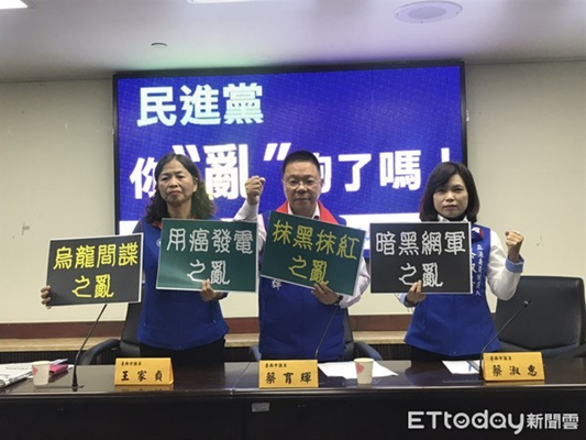 中国台湾网12月9日讯 据台湾“东森新闻云”报道,台湾2020年“立委”选情进入倒计时,国民党议员蔡育辉、蔡淑惠、王家贞9日召开“民进党,乱够了吗!”记者会,怒指国民党台南市6位“立委”参选人,全都被民进党对手“抹黑”“抹红”。民进党利用执政利器制造各种乱象是选情告急吗?