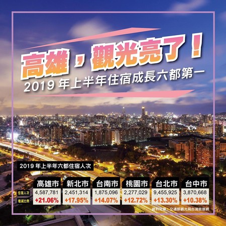 从韩国瑜拿出“交通部观光局”台湾旅宿网的数据可以看出,高雄市在2019年上半年住宿人次高达458万7781人,成长率21.06%,名列“六都”第一。新北市住宿人次达245万1314人,成长率17.95%,位居第二。台南市住宿人次为187万5096人,成长率14.07%,排名第三。(中国台湾网 王琳)