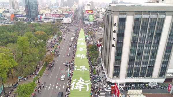 而“罢韩”活动则宣称因人数爆表,延后30分开始。发起人尹立还声称游行共有50万人走出来。“罢韩”群众刻意装扮,队伍起走后,有群众拉起210米长、12米宽的“光复高雄 保卫台湾”绿色大布条,超巨大布条下方没有站人,被嘲讽是“人数作弊道具”。