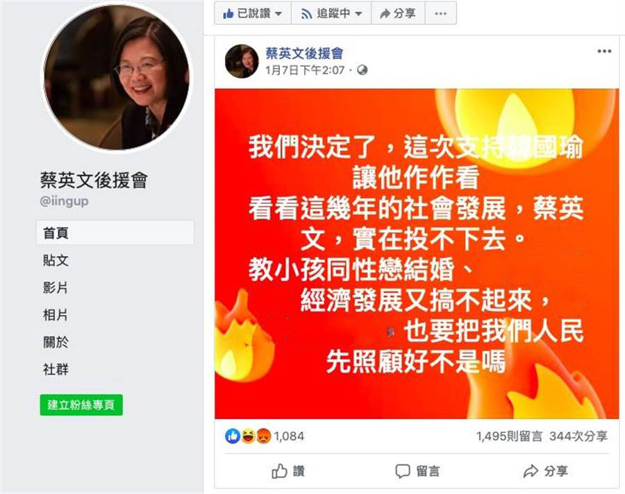 倒戈了!经营4年“蔡英文后援会”粉专竟改挺韩国瑜