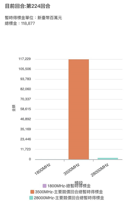 据报道,主流频段3.5GHz在第225回合的最新竞价,以暂时得标总标金1172.29亿元,相较于该频段总底价243亿元,高出3.8倍,每一个区块(10MHz)标金相当于43.42亿元暂时得标。(中国台湾网 李宁)