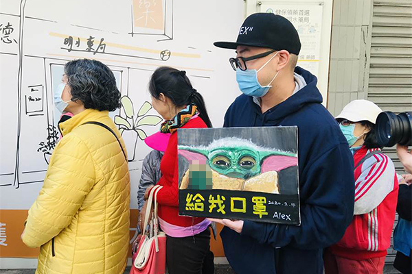 中国台湾网2月6日讯 据台湾“中时电子报”报道,台当局推行的口罩实名限购措施6日起实施,许多民众一早便持健保卡排队购买。有排队民众自行绘制影视作品《星球大战》中“尤达大师”的形象暗讽蔡英文,并在画作上写着“给我口罩!”暗呛台当局。