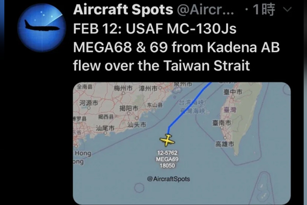 中国台湾网2月12日讯 据台湾“联合新闻网”报道,美国社交媒体账号”飞机守望”12日披露,美国空军两架编号MEGA68、MEGA6869的MC-130J特战运输机,今天中午沿台湾海峡中线,由北向南飞行,穿越台湾海峡上空。根据该社交媒体账号披露的航迹,未交待两机最后去向,但根据过去惯例,通常是飞返嘉手纳基地。