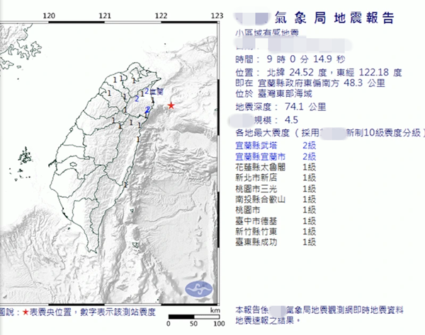 今天(25日)上午9时,台湾东部海域发生一起里氏4.5级地震。(图片取自台媒)
