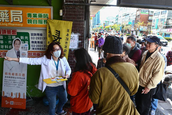 岛内实名制购买口罩措施上路后,常见到健保特约药局外排满民众。(图片来源:台湾“中时电子报”)