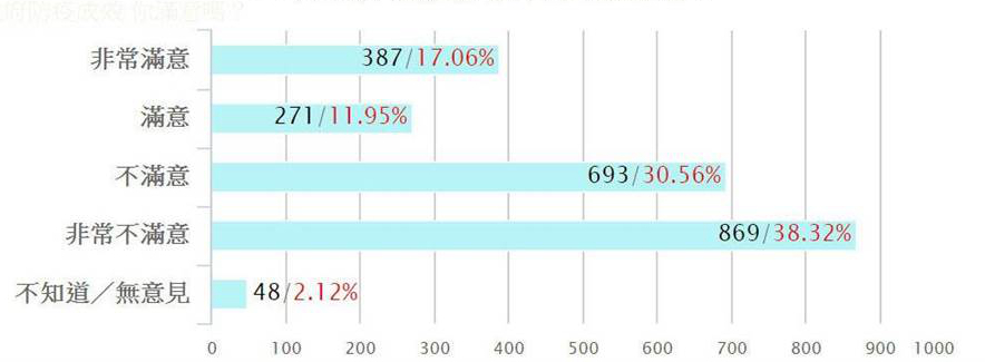 在9小时投票中,有逾1万多名读者点阅,2,268名网友参与投票,非常满意者为17.06%、满意者11.95%、不满意者30.56%、非常不满意者38.32%。(中国台湾网 李宁)