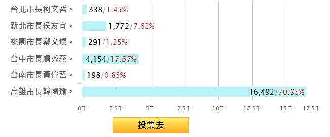 截至28日早上8点47分许,共计有23245票,民进党籍桃园市长郑文灿只获得291票,仅占1.25%;民进党籍台南市长黄伟哲获得198票,占总票数0.85%;无党籍台北市长柯文哲拿到338票,占总票数1.45%。国民党籍台中市长卢秀燕获得4154票,占总票数17.87%;国民党籍高雄市长韩国瑜拿下16492票,高达总票数70.95%,新北市张侯友宜拿下1772票,占总票数7.62%。(中国台湾网 李宁)