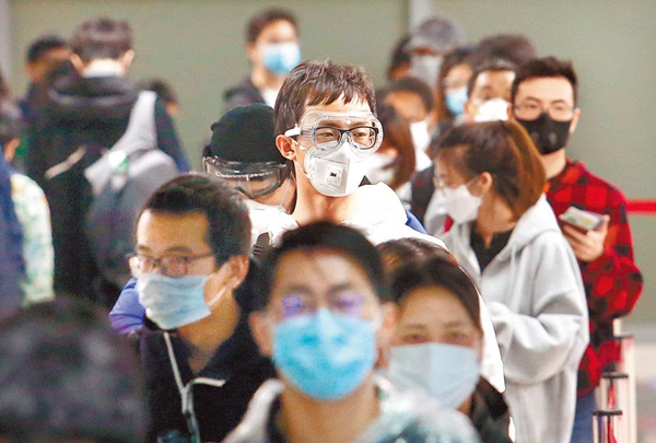 台湾自24日起禁止所有旅客在台过境转机,在桃园机场第二航厦,一群过境的旅客排队准备安检。(图片来源:台湾“中时电子报”)