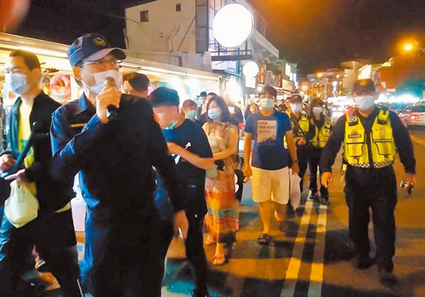 对于垦丁街上人潮摩肩擦踵,警方在大街上兵分两路,步行及开着巡逻车沿街广播,提醒民众“保持社交距离”。(中国台湾网 李宁)