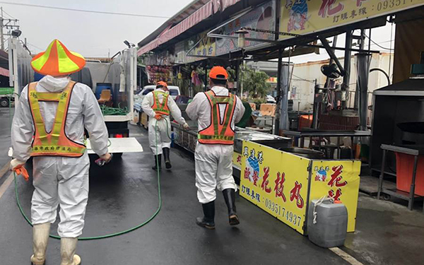 中国台湾网4月6日讯 据台湾《旺报》报道,因应新冠肺炎疫情影响,高雄市兴达观光渔市协会总干事郑瑞益与市议员李亚筑6日找来消毒水车,为140个摊位彻底消毒。两人都希望这波疫情赶快过去,让兴达观光渔市的生意可以恢复往昔热闹。