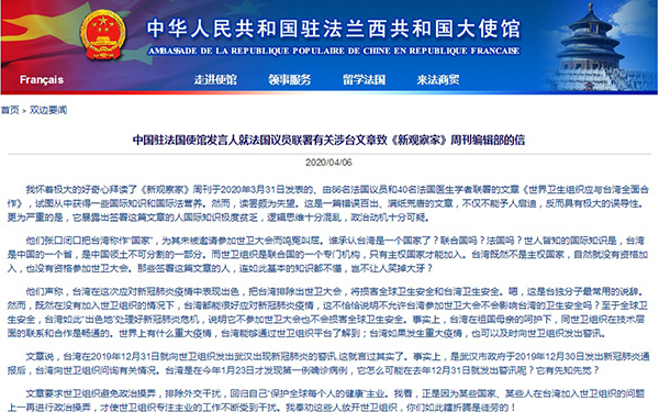 4月6日,中国驻法国使馆官网刊文《中国驻法国使馆发言人就法国议员联署有关涉台文章致<新观察家>周刊编辑部的信》。(图片来源:中国驻法大使馆官网)