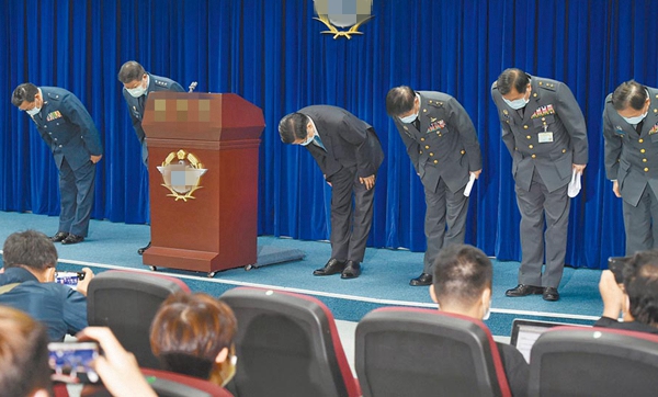 在舆论压力下,民进党当局防务主管部门负责人严德发(右四)21日晚开记者会向社会鞠躬道歉。(图片来源:台湾《中国时报》)