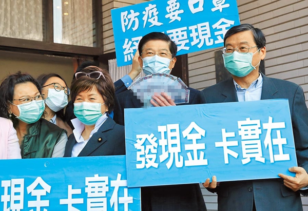 民调显示,83%的民众赞成发现金或消费券。图为台“立院”国民党团4月10日发表“发现金给口罩”主张,要求民进党当局发放纾困现金。(图片来源:台湾“中时电子报”)