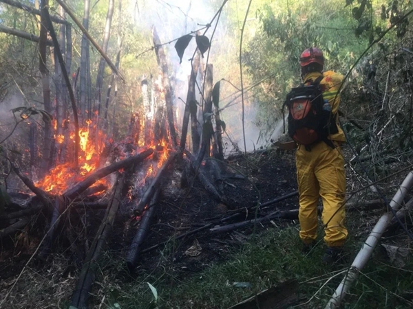 高雄市六龟新威山区昨起发生林地山火,竹林燃烧后火势猛烈。(图片取自台媒)