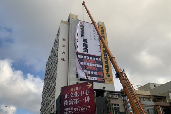 有报道称,这已经是本周内第3块被拆除的“罢韩”广告牌,被拆除的3块广告牌全部是因违反了高雄市相关规定才被拆除。(中国台湾网 李奕均)