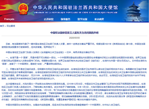 法媒刊登鼓吹"台独"文章 中国驻法使馆:严重误导法国民众。(图片来源:中国驻法国大使馆网站截图)
