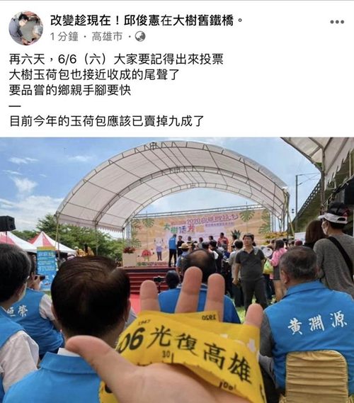 2020高雄凤荔季开幕典礼30日上午举行,韩国瑜与多位局处首长、议员均出席这场盛事,民进党议员邱俊宪也参加了这场活动。仪式进行到请在场来宾上台时,包括司仪、高雄市新闻局长郑照新皆上前邀请邱俊宪一同上台,但他当场婉拒,仍然坐在台下贵宾区。不料,没多久邱俊宪就在脸谱网发文,写着“再六天,6/6(六)大家要记得出来投票”,并附上一张在台下手拿“光复高雄”黄丝带、台上韩国瑜正在颁奖的照片。