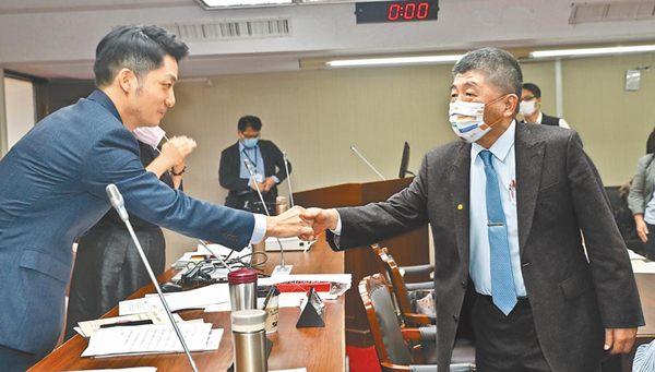 台“立法院”12日举行“开放含莱克多巴胺猪肉进口,对民众健康之影响与危害”公听会,会议结束后,台当局“卫福部长”陈时中(右)趋前向“召委”蒋万安(左)握手致意。(图片来源:台湾“中时新闻网”)