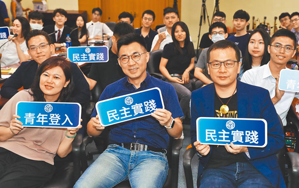 传绿营为反制蓝营“割莱委”行动,也将提罢免国民党主席江启臣(前排中)、罗智强(前排右)、谢龙介等人。(图片来源:台湾“中时新闻网”)