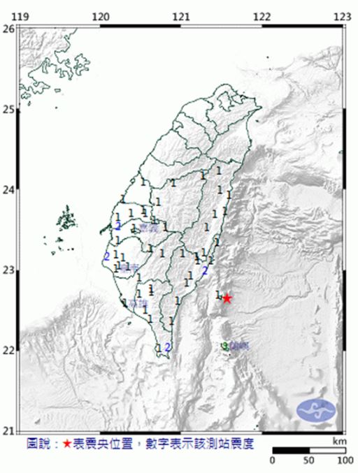 今天上午09时50分,台湾台东县海域发生4.5级地震。(图片取自台媒)