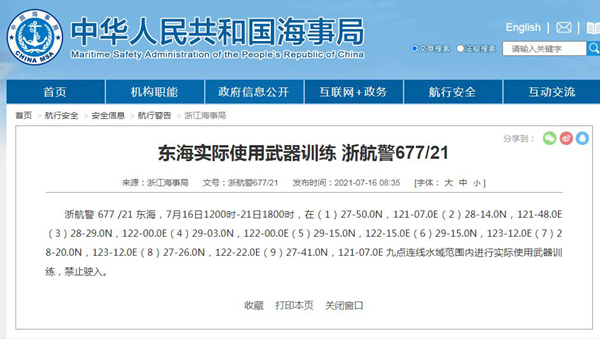 中国台湾网7月17日讯 据中国海事局网站消息,浙江海事局16日发布航行警告,7月16日12时至21日18时,东海部分海域将进行实际使用武器训练,禁止驶入。此事引发台媒关注,称此次军演范围距离台湾本岛最近距离仅约243公里。