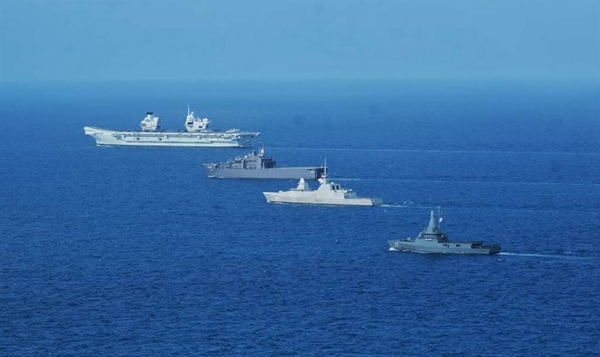 图为英国“伊丽莎白女王”号与新加坡海军进行会合演习。