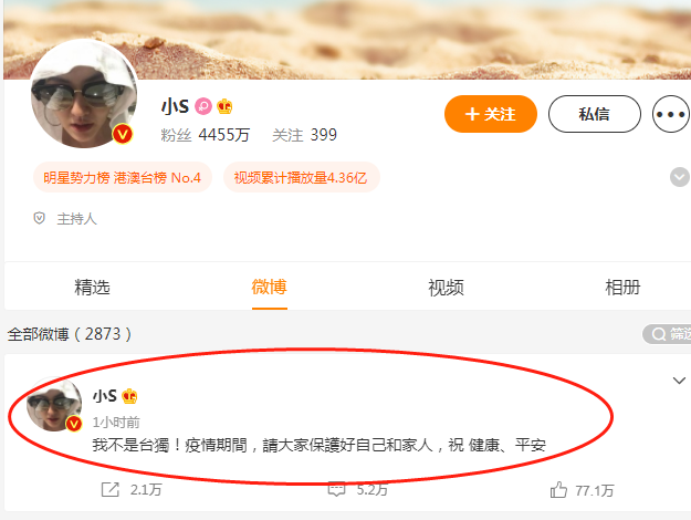 中国台湾网8月5日讯 5日下午,台湾艺人徐熙娣(小S)在微博公开发声,称自己不是“台独”,并提醒“疫情期间,大家要注意防护”。