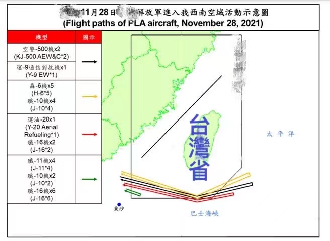 据台军方公布的消息,解放军当日共派出27架次军机在日间进入台湾岛空域,包括2架次空警-500、1架次运-9通信对抗机、5架次轰-6、1架次运-20、6架次歼-10、4架次歼-11、8架次歼-16。台军公开的解放军活动示意图显示,解放军部分军机从台岛西南与东沙岛东北方向之间的空域,进入台方划设的所谓“防空识别区”,并经台岛南部巴士海峽飞至台岛东南方向,又循相同航迹返回。台军则称派出空中兵力陪飞,进行所谓“广播驱离”,防空导弹“追监”。