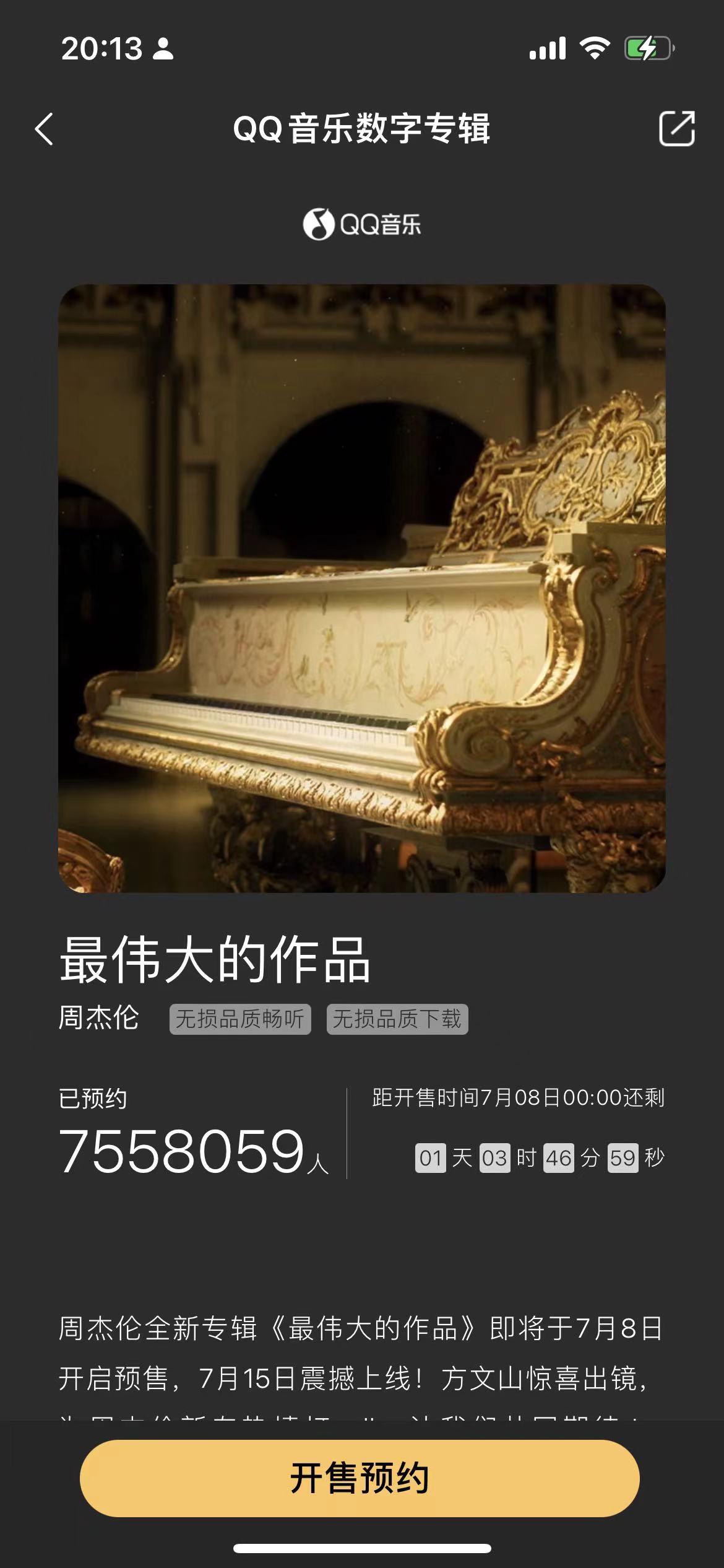 据QQ音乐显示,周杰伦第15张专辑《最伟大的作品》先行曲MV将于7月6日中午12时首播上线。《最伟大的作品》数字专辑预约现已开启,截至7月6日20时,预约人数超755万人次,将于7月8日开启预售,7月15日上线。