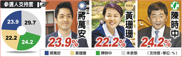 调查结果发现,陈时中阵营有56.1%属于铁票,17.9%表示会转投黄珊珊、10.2%改支持蒋万安、15.8%转为不投票或不表态;若蒋万安声势落后,有5成仍坚定拥蒋,34.1%会转支持黄珊珊、4.7%倒戈到陈时中、11.2%转为不投票或不表态。