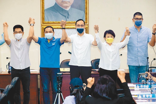 中国国民党17日举行中常会,通过提名侯友宜、卢秀燕竞选连任新北与台中市长,党主席朱立伦(中)牵着新北市长侯友宜(左二)、台中市长卢秀燕(右二)的手,在中常委的加油声中高喊“胜利”。(图片来源:台湾“中时新闻网”)