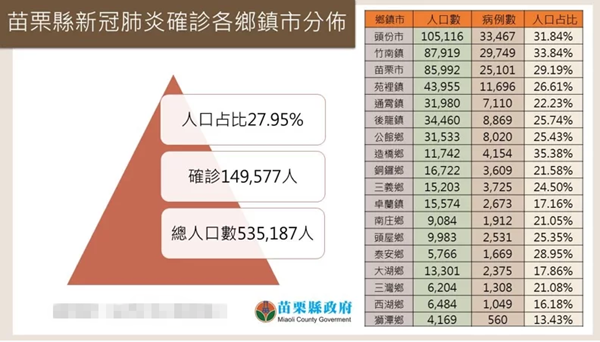 苗栗县今天新增1155例,今年迄今累计本地病例149577人,人口占比确诊率达27.95%。(图片取自台媒)
