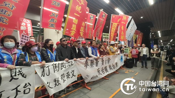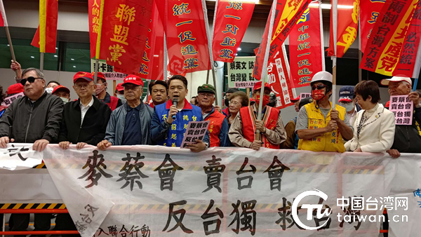蔡英文4月7日晚返台,统派团体组织近300人前往桃园机场进行抗议,批判所谓“麦蔡会”是“卖台会”。(中国台湾网发)