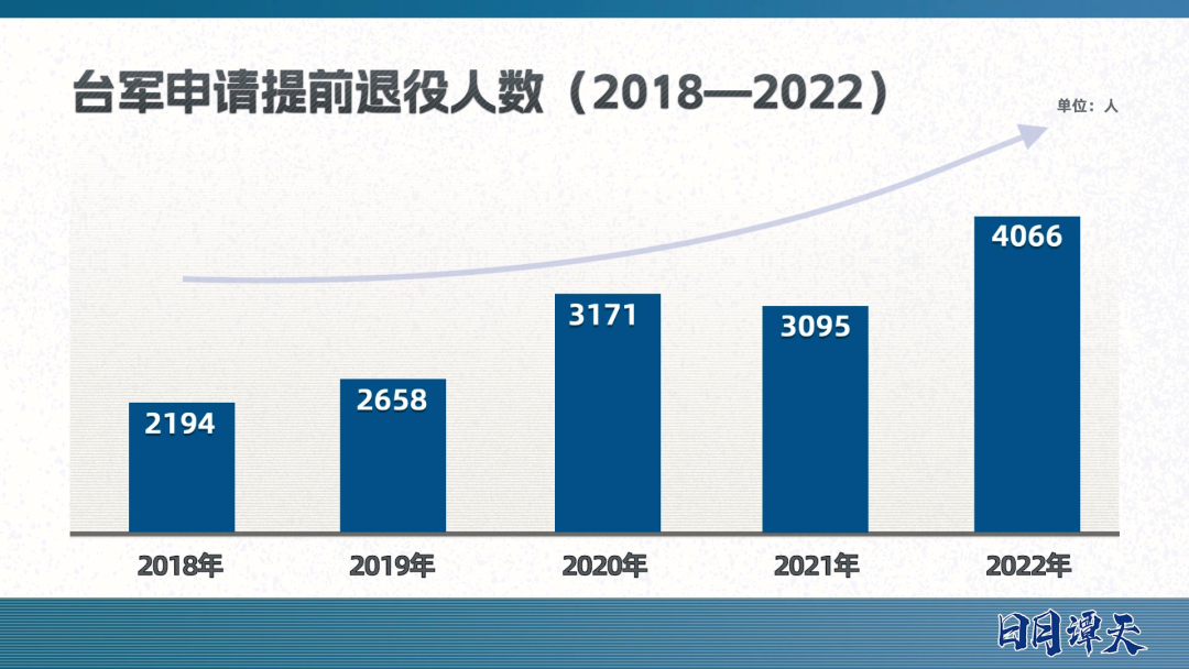 显然,冯世宽被踩了尾巴、戳到了痛处。岛内媒体披露,2022年台军士兵提前退役人数创下历年新高,骨干兵员流失严重。最近,“台军去年有4000多人申请提前退役”的话题登上了岛内新闻热搜榜。